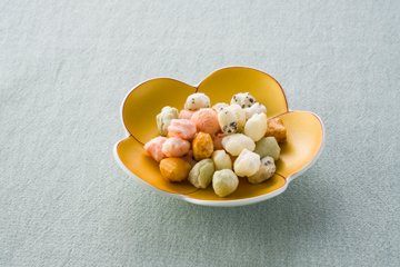プレーン味、海老味、ゴマ味、青のり味の4種類がミックスではいっていて、その上から砂糖でコーティングしてあります。